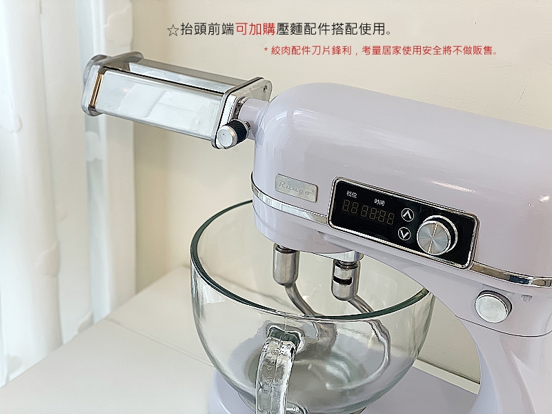 ☆抬頭前端的擴充配件非標配,需另外單獨購買,因絞肉配件刀片鋒利,考量居家使用安全將不做販售,其餘壓麵配件的販售時間與價格,將於正式上市後陸續公佈。
