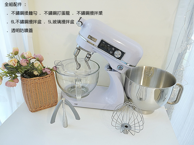☆6L輕音雙軸標準配件含:304不鏽鋼揉麵鈎(長、短鈎各一)、304不鏽鋼打蛋籠、304不鏽鋼混料槳(玻璃盆專用爪型款)、6L 304不鏽鋼攪拌盆、5L玻璃攪拌盆、透明防濺蓋、雙軸專用矽膠保護套。