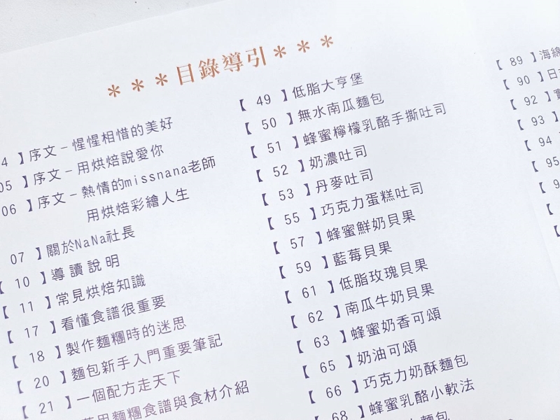 【 04 】序文–惺惺相惜的美好【 05 】序文–用烘焙說愛你【 06 】序文–熱情的missnana老師用烘焙彩繪人生【 07 】關於NaNa社長【 10 】導 讀 說明【 11 】常見烘焙知識【 17 】看懂食譜很重要【 18 】製作麵糰時的迷思【 20 】麵包新手入門重要筆記【 21 】一個配方走天下【 22 】萬用麵糰食譜與食材介紹【 23 】食材採購小筆記【 25 】練好製作麵糰的基本功【 26 】麵糰製作練習【 27 】快樂做麵包【 28 】官方生吐司–萬用麵糰食譜【 29 】官方生吐司–麵糰製作【 30 】官方生吐司–基發與整形【 31 】官方生吐司–後發與烘烤【 32 】關於吐司與麵包– 我要問【 34 】萬用麵糰的奇幻之旅【 35 】小餐包【 36 】蔥麵包【 38 】咖哩蔥麵包【 40 】玉米火腿乳酪麵包【 41 】巧克力生吐司【 43 】巧克力麵包捲【 46 】波蘭種官方生吐司【 47 】麥香生吐司【 48 】低脂女神吐司【 49 】低脂大亨堡【 50 】無水南瓜麵包【 51 】蜂蜜檸檬乳酪手撕吐司【 52 】奶濃吐司【 53 】丹麥吐司【 55 】巧克力蛋糕吐司【 57 】蜂蜜鮮奶貝果【 59 】藍莓貝果【 61 】低脂玫瑰貝果【 62 】南瓜牛奶貝果【 63 】蜂蜜奶香可頌【 65 】奶油可頌【 66 】巧克力奶酥麵包【 68 】蜂蜜乳酪小軟法【 69 】煉乳小麵包【 70 】餐前小麵包佐松露醬【 71 】巧克力夾心兔子麵包【 72 】抹茶雪芙麵包【 73 】聖誕水果麵包–潘納朵尼【 74 】波蘭種布里歐杯子麵包【 75 】迷你肉桂捲【 77 】千層肉桂捲【 78 】最溫柔的甜點–蛋糕【 79 】巴斯克乳酪蛋糕【 80 】玫瑰戀人巴斯克乳酪蛋糕【 81 】焦糖香蕉磅蛋糕【 83 】戚風蛋糕製作前的小預習【 84 】戚風蛋糕【 86 】戚風蛋糕不一樣的美【 87 】有故事的麻香戚風蛋糕【 88 】麻香戚風蛋糕【 89 】海綿蛋糕【 90 】日式棉花蛋糕【 92 】實用奶油抹面蛋糕體【 93 】夏日檸檬奶油蛋糕【 94 】鮮奶油抹面蛋糕【 95 】奶油霜小知識整理【 96 】動物性鮮奶油打發重點整理【 97 】草莓奶油蛋糕【 98 】煉乳杯子蛋糕【 99 】乳酪杯子蛋糕【100 】檸檬瑪德蓮蛋糕【101 】純米粉巧克力瑪德蓮【102 】玫瑰曲奇餅乾【103 】瑪格麗特餅乾【104 】蛋黃酥【106 】去有風的地方-雲南玫瑰鮮花餅【107 】鳳梨酥餅皮【108 】楊枝甘露酥【109 】抹茶紅豆冰皮月餅【110 】鮮奶饅頭【111 】湯種鮮奶玫瑰饅頭【112 】酸菜肉包【113 】雞蛋牛奶布丁【114 】布丁的為什麼【115 】鮮果乳酪抹醬【116 】裝飾用巧克力糖花【117 】為作品拍美照【119 】詞窮,也能輕鬆發文分享【120 】幸福的呼喚–我回來了【121 】甜蜜小角落–給世界的情詩【122 】十年一刻【123】烘焙人的快速料理【124】咖哩豬肉蛋炒飯【125】彩椒鮭魚燉飯【126】咖哩蝦仁冷麵【127】酒釀菇菇雞湯【128】烘焙之路,感謝同行【129】一起同行的烘焙人【131】Rungo 攪拌機全系列【132】版權資訊