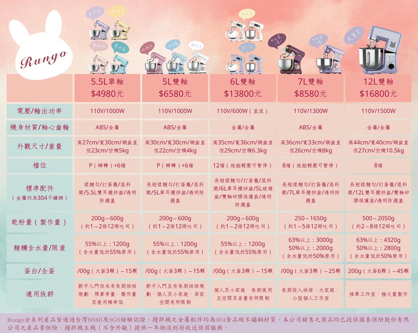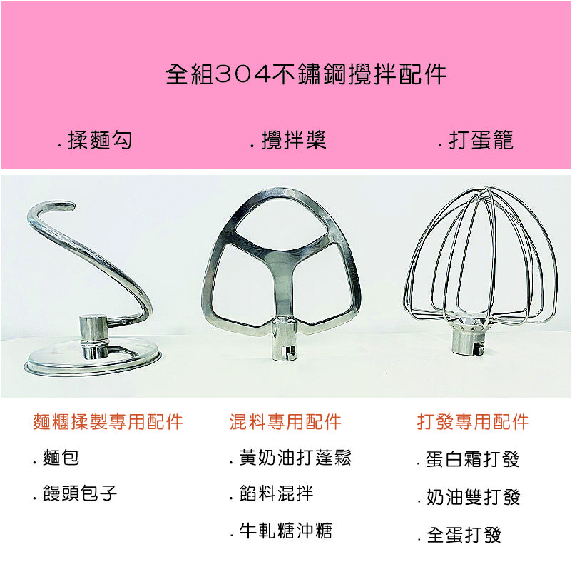 . 產品配件 : 304不鏽鋼攪拌盆、揉麵勾、打蛋籠、攪拌槳、透明防噴蓋