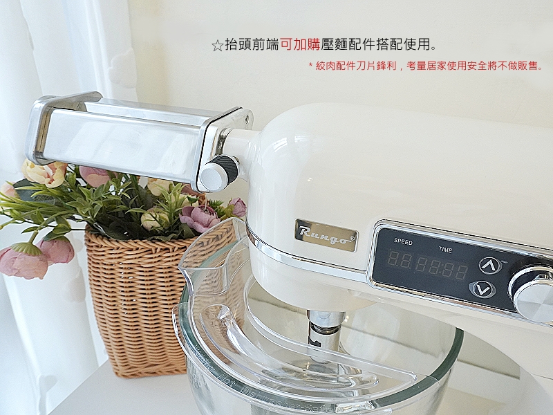 ☆抬頭前端的擴充配件非標配,需另外單獨購買,因絞肉配件刀片鋒利,考量居家使用安全將不做販售,其餘壓麵配件的販售時間與價格,將於正式上市後陸續公佈。